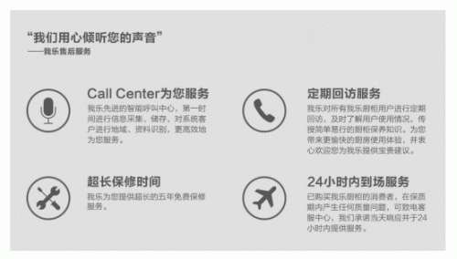 而且我乐会进行有关使用等方面的技术指导,保证维修零配件的及时供应及质量的把控。除了对产品实行“三包”,即包修、包换、包退之外,还有处理消费者来信来访以及电话投诉意见,耐心解答消费者的售后咨询。我乐还会根据情况及时改进,根据消费者要求,进行有关使用等方面的技术指导;其中,我乐提供产品定期维护、定期保养的方式受到了广大消费者的广泛好评。