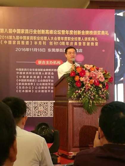 行业创新高峰论坛暨年度创新金牌榜颁奖典礼在东莞举行,活动当天汇集了行业众多领袖与精英,就行业前沿的热门话题进行探讨,在会上,皇朝家私荣登家具行业创新金牌榜,旗下Ihome系列一举斩获2016中国家具行业十大时尚沙发品牌,副总裁褚汉青先生与品牌总监陈瑞鑫先生荣获中国家具行业十大杰出职业经理人、2016中国家具行业十大创新职业经理人称号。