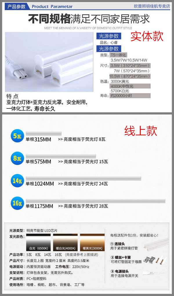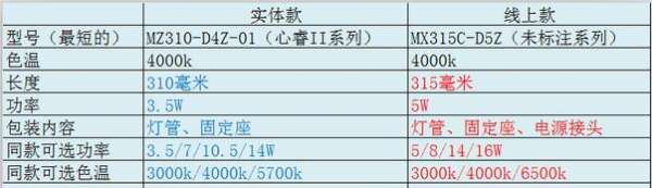 5毫米的长度差咱先忽略不计,当做是同样长度的。而功率,两者足足差了1.5W,线上款理论上更亮。而且在同款中,可选的功率、色温也不同,线上款功率都会更大一些。另外,线上款配件还多了一根电源接头。