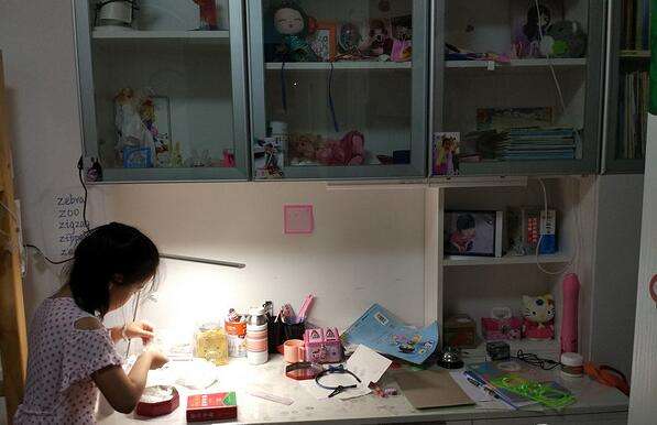 小妞的书桌是他爹我量身定做的,长度约1.5米。她的台灯放左边只能管约2/3的面积,右边比较黑。本来小妞自己用是无所谓的,但是由于老二的婴儿床占了老婆的书桌位子,因此这段时间怀孕的老婆只好和小妞拼桌子备课。这样一来,老婆那右边的亮度就明显不够了。