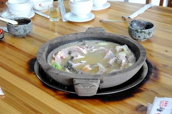 “魔石咕噜鱼”餐馆位于上林县城明澄大道边,距县城客运中心2公里,是2013年在上林县开业的一家全国连锁餐饮企业,总部在重庆。加盟引进该餐馆的老板谢和平,是土生土长的上林本地人。据谢和平介绍,“魔石咕噜鱼”最大的特色是用石头与鱼做菜,用石锅盛煮,所用的石头、石锅可不一般,石头是麦饭石,石锅即木鱼石。石锅经中国辐射环境管理监测中心多位教授分析、检测,它富含锌、铁、钙、镁等多种对人体有益的微量元素,可达到强身健体的养身功效。谢和平说,煮鱼时,先把石锅放在烤炉内烘烤,加热到300度以上,然后端到桌上,垫上锡纸,倒入独家秘制煨好的高汤,再把切好的鱼块和三块麦饭石放入汤中,然后轻轻把锡纸抽走,让鱼和汤完全进入锅中,汤一经接触高温发烫的石锅,顿时冒气翻滚,此时,鱼在石中,石在鱼中,“咕噜咕噜”作响,“咕噜鱼”因而得名。在高温作用下,石锅中的微量元素逐渐分解于汤中,与鱼肉充分融合,使鱼汤鲜美至极。