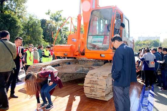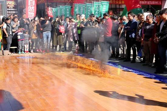 活动的高潮部分在机甲惊天大挑战环节,在活动现场的西门口,上演了大自然地板挑战22吨挖掘机和抗击火烧的破坏性试验,大自然木地板在挖掘机的重力压迫下和火烧的摧毁下竟然没有丝毫损坏之处,让现场的消费者们大开眼界,纷纷上前端详抚摸,并表示对购买大自然的木地板十分放心。