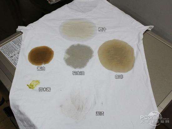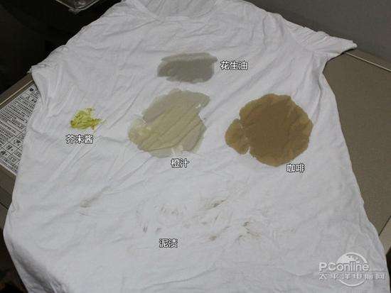 为了测试一下洗净度,笔者在一件白色T恤上涂上了5种污渍,其中橙汁、咖啡的污渍以及泥渍应该是生活中比较容易出现的衣物污渍,看看棉麻模式的洗净能力如何。