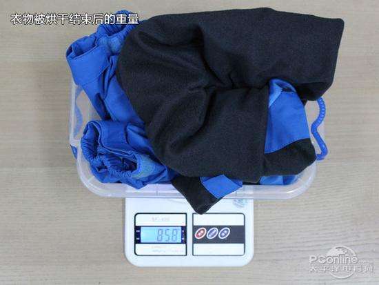烘干过程结束后,衣物的重量为858克,基本与干燥状态下的856克吻合,衣物的内绒也被完全烘干,真正达到了即干即穿的状态。