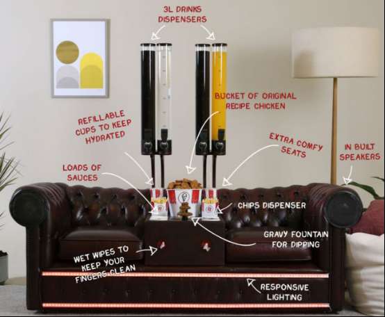 上校沙发中间的岛台给原味鸡、薯条、酱汁和饮料都设置了各自的位置,还内置4个3L软饮分配器、湿纸巾、甚至是梦幻肉汁喷泉。