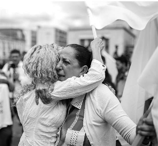 两名支持签署和平协议的女子相互拥抱。 新华社发