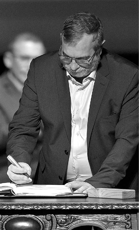 11月24日,哥伦比亚总统桑托斯(前)签署新和平协议。 新华社发