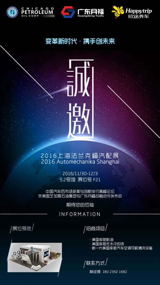 11月30日―12月3日,美国芝加哥石油集团、广东月福集团、广州欣途汽车科技有限公司将携库驰CACHIE系列汽车养护产品亮相2016上海法兰克福
