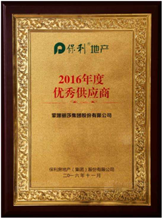在供应商颁奖典礼上,蒙娜丽莎集团凭借着优异的产品质量、强大的研发实力、无可比拟的施工优势、完美的配套服务等,荣获保利地产2016年度优秀供应商称号,是保利地产评出的极少数几家优秀供应商之一,更是瓷砖行业唯一的一家。