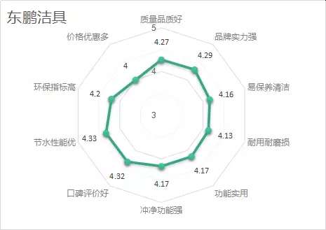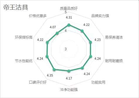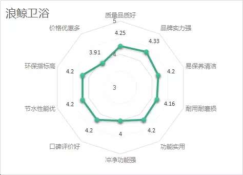 卫浴在“品牌实力”方面的评价最高,同时其在“易保养清洗”、“功能实用”、“口碑评价”、“节水性能”、“环保指标”的评分均为4.20,显示浪鲸卫浴同样是一个发展较为均衡的品牌,而且也颇受消费者认可。