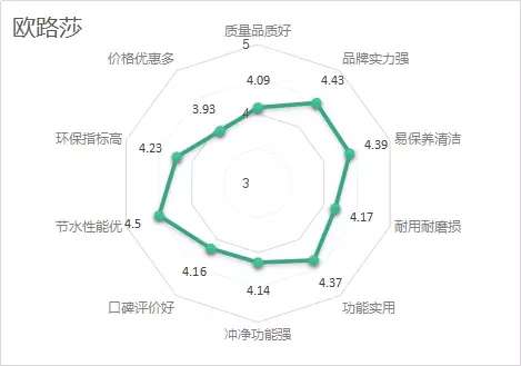 欧路莎在“节水性能”方面的得分不单是该品牌在十项指数中得分最高的,还是在各品牌的这一指标上得分最高的。此外,其在“易保养清洗”和“功能实用性”上的得分也处于较高水平,显示在消费者的认知中该品牌具备一定的特色。