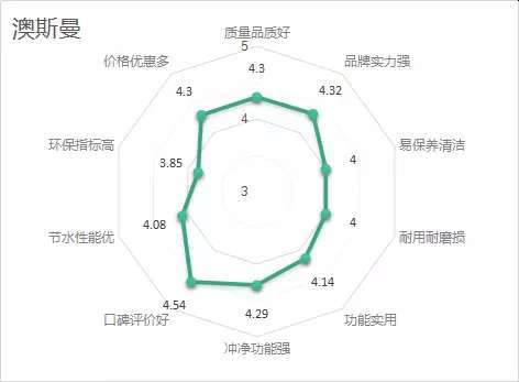 澳斯曼在“口碑评价”方面的得分在十项指数中最高,而在“价格优惠”方面的评分也优于各品牌此项指标的平均水平,同时其“质量品质”的评价也较高,显示出消费者对该品牌的知名度、质量和价格均有较高评价。
