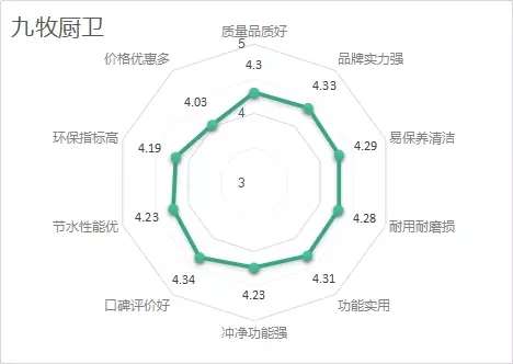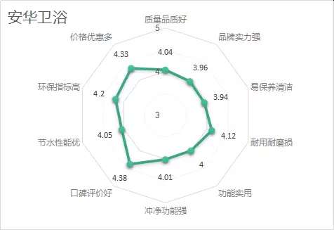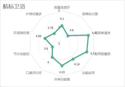 的图表形状最为“错落有致”。在消费者关注的10大因素中,航标卫浴在“易保养清洗”和“耐用耐磨损”方面的评分最高,分别达到4.67和4.57,同时这也是各品牌中在该两项指标中表现最好的。