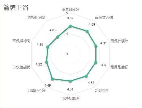 在消费者所关注的10大因素中,箭牌卫浴在6个因素上的指标均明显高于各品牌的平均水平,特别是在“质量品质”上的表现更是各品牌中最为优秀。另外,在产品的“易保养性”、“实用性”和“耐用性”上也较受认可,这也是箭牌卫浴能有较好“口碑评价”的原因。