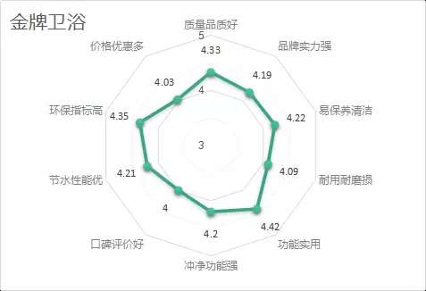 金牌卫浴在“功能实用性”和“环保指标”上的评分既是该品牌在10项指标中评分最高的,也是各品牌中在该两项指标上表现最好的,这显示金牌卫浴在产品层面上获得了消费者的认可。