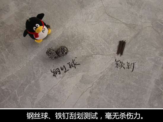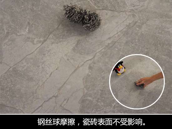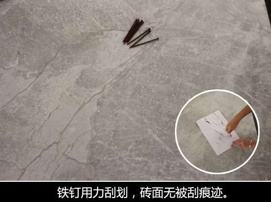瓷砖耐磨性差,使用一段时间后瓷砖表面就容易出现很多划痕,从而影响视觉效果。小编为检测瓷砖的耐磨度,采用了钢丝球和铁钉刮划来进行测试。