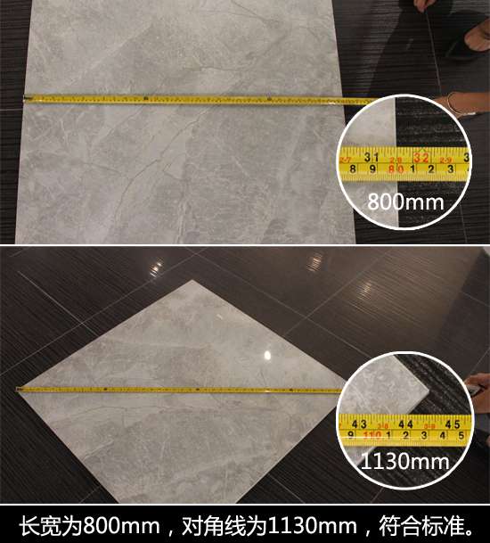 瓷砖尺寸、厚度符合国家标准,长宽均为
