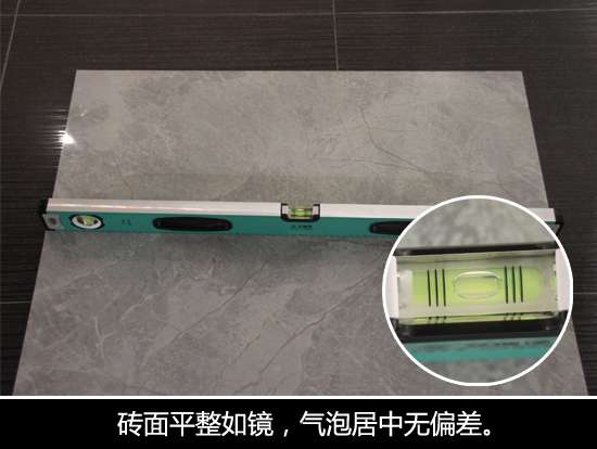 瓷砖平整时,水平仪中间观察窗的气泡会处于居中的位置,无任何偏向。经小编测量发现,气泡居中无偏向,证明这款原石