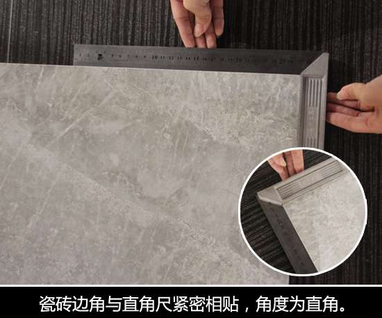 为进一步证明这款瓷砖的平整度,小编用直角尺测量瓷砖的边角,通过观察发现其线条笔直,没有丝毫的弯曲,瓷砖边角线垂直度很高,边角为直角。