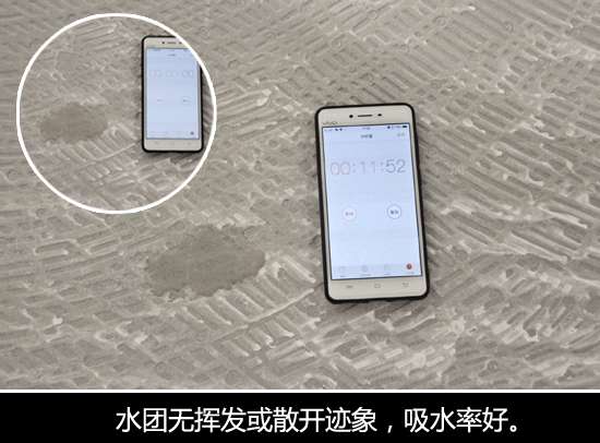 吸水率是指石材在标准大气压力下吸水的能力。石材的吸水率是由其中空隙的数量和大小、颗粒相互排列的方式等因素决定。吸水率越小的石材越紧密坚硬,水团不容易挥发或散开。小编将水倒在瓷砖背面,静待十多分钟后发现,水团并无散开或挥发的现象,可见这款瓷砖的防水防潮性十分好。