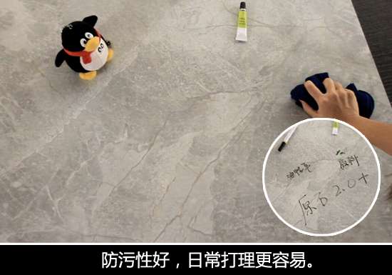 如果瓷砖的抗污性差,必定对日常的保养与清洁产生极高难度,同时也会影响用户的使用效果与使用体验。小编通过用油性笔在砖面上写字的方法测试发现,只需用抹布轻轻擦拭就能将字迹轻松地处理干净,不需要任何洗涤剂。