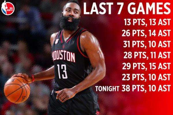 火箭在客场130-114大胜开拓者,获得两连胜,哈登全场比赛获得了38分10次助攻,这是哈登火箭生涯第12次获得至少35分10次助攻的数据,继续刷新火箭队史的纪录,同时,哈登单月获得至少30分10次助攻的次数也比肩了传奇迈克尔-乔丹。