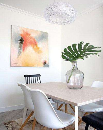 小餐厅的设计些许素雅,原木色和白色的运用让这个小小的空间显得干净整洁,墙上一幅意象派装饰画也提高了餐厅的档次。