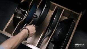 竖向存储抽屉&竖向存储高柜,方便存放扁平且无法叠放的厨具(如中式炒锅,平底锅,大餐盘等),可利用抽屉隔板自由定义储物空间,空间利用最大化。更有抽屉隔板人性化的凹槽设计,取放自如。