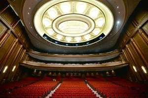 打开古铜色大门,可以看到大剧院的共享大厅,抬头看,房顶呈水滴状晕开。沿着引导牌走,左手边是歌剧厅和音乐厅,右手边是综艺厅和戏剧厅。