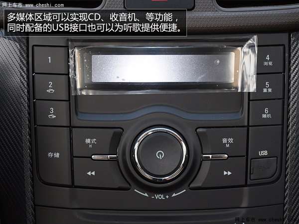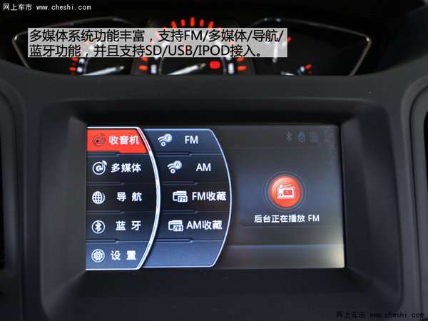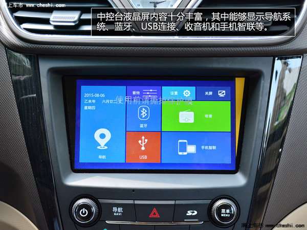 中央显示屏下方的操控键可以进一步方便控制,多媒体系统功能丰富,支持FM/多媒体/导航/蓝牙功能,并且支持SD/USB/IPOD接入。