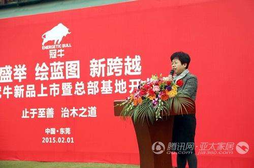 冠牛董事长庞军在典礼大会上首先发言,并对参会的经销商致以最热烈的欢迎。庞总讲话铿锵有力,从冠牛总基地的规划到落成谈起,让大家看到冠牛雄厚的企业硬实力。他从当前宏观环境出发,深入剖析了国内经济的发展趋势以及木门行业面临的机遇与挑战。谢淑华总裁第二个发言,她向大家阐述了冠牛16年发展的历程,并对冠牛2015年提出了展望和期待。