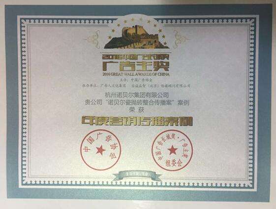 2016年10月23日下午,“2016中国广告长城奖?广告主奖”颁奖盛典在海南国际会展中心隆重举行。经过严格筛选,激烈角逐后,诺贝尔集团最终脱颖而出,诺贝尔瓷抛砖整合传播案获得“中国广告长城奖广告主奖?年度营销传播