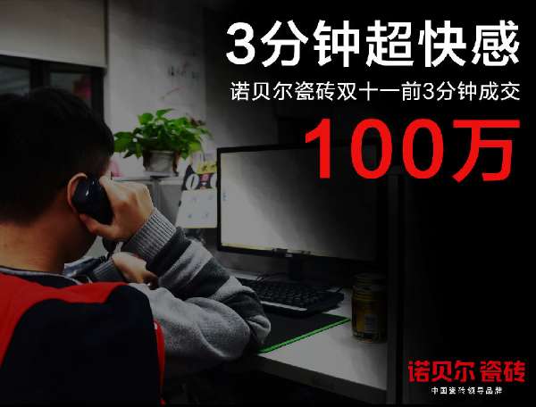 据悉,今年是诺贝尔瓷砖参加天猫双十一活动的第二年,适逢企业战略调整元年。为了能取得更好的成绩,诺贝尔早早就开始布局,围绕“全渠道营销”战略,开展了一系列宣传活动,如“网上预约定金”、“红约计划”等,正是这一系列的线上、线下的联动宣传,双十一狂欢盛宴刚开始3分钟,诺贝尔瓷砖天猫官方旗舰店交易额已突破100万;5小时,打破去年诺贝尔自己保持的瓷砖类目成交记录;早上9点46分交易额更是突破1亿元大关,率先进入瓷砖品类亿元俱乐部。以实力为低迷的瓷砖行业注入一针强心剂!