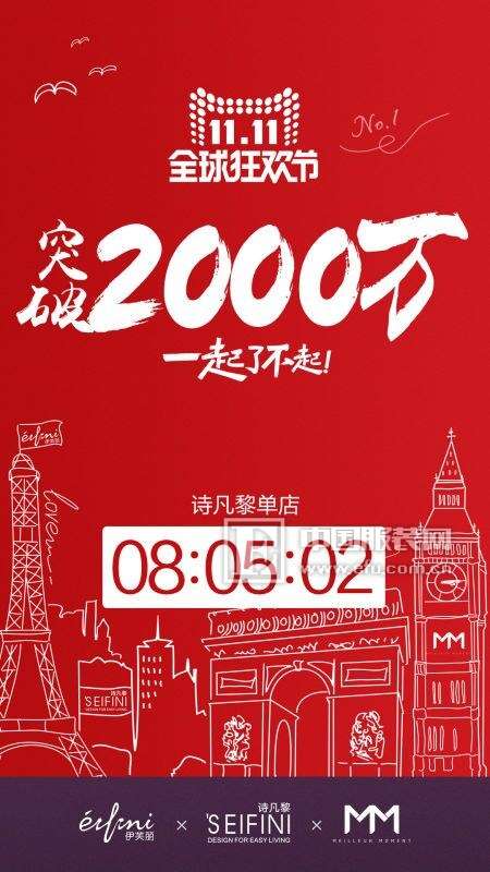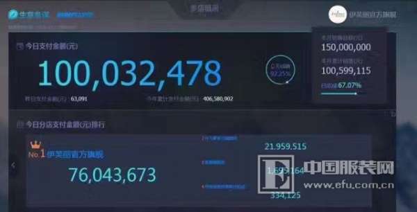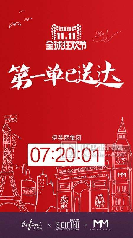 中国服装网记者还了解到,今早7点20分,伊芙丽女装第一单送达客户手上。此外诗凡黎单店8点05突破2000万,超过去年全天销售额。