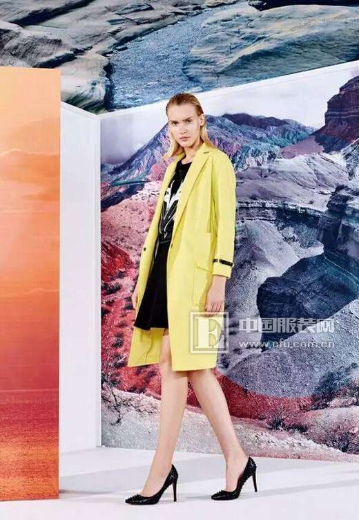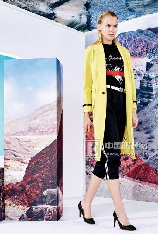 【LOOK5】明黄色的风衣给早春带来了与众不同的色彩,经典简约的修身廓形,易搭配,面料弹力感好,光泽感丰富,内搭时尚花型与珠片绣的设计小衫和锥形裤,都是2016春季绝对要入手的物件。