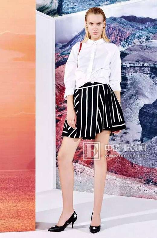 【LOOK4】极致干净达练的白衬衫,与百搭黑白条纹小A型半裙组合,恰到好处拉长身材线条,展现了女性俏皮之美。