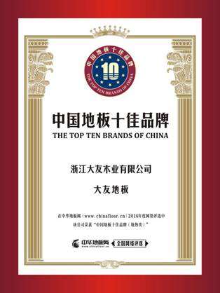 2016年9月1日,由中国地板行业权威门户网站——中华地板网举办的2016“中国地板十佳品牌、中国地板十大品牌”全国网络评选活动中,大友地板以超高的人气和支持率,在权威评审专家的一致认可下,蝉联“2016中国地板十佳品牌(实木类)”和“2016年中国地板十佳品牌(地热类)”两项殊荣,受到业内外的广泛关注,品牌知名度再上新台阶。