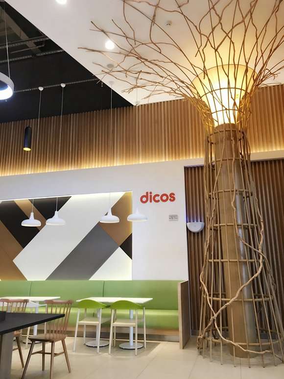 与德克士其他门店相比,这家“舒食+”餐厅采用了森林风格的设计主题,店内主打绿色和原木色的大地色系,柱灯装饰为大树形象,桌椅空间也更加宽敞,在德克士内部被昵称为“森林店”。