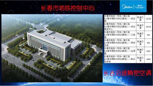 吉林省美的暖通设备销售有限公司近几年在当地建立了众多行业性质的样板工程,轨道交通行业包括吉林省长春市西客站综合交通枢纽、长春市火车站北出口、长春市地铁控制中心、长春市地铁1号线辅助配套用房;医疗行业包括长春市中心医院、吉林大学二院、吉大医院二部、中日联谊医院、长春市骨伤医院、吉林市人民医院一期、二期、三期、延吉市妇幼保健院、延吉市中医院、延吉市河南医院等;金融行业包括:工商银行、建设银行、
