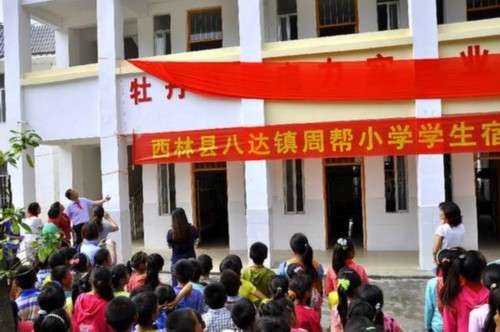 周帮村是西林县典型的石山苗族村,群众居住分散,交通不便,全村就读于周帮小学的397名学生中就有380名住校生,学校住宿条件有限,压力很大,常常是两三个同学挤在一个床铺睡觉。当了解到这一情况后,自治区妇联积极牵线搭桥,由与西林县相距万里的黑龙江省牡丹江电力实业集团捐资50万元,西林县配套70万元,于2013年6月动工建设了周帮小学学生宿舍楼。该宿舍楼建筑总面积为668平方米,其建成并投入使用,有效地解决了周帮小学苗家娃子们的住宿难问题。