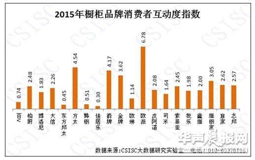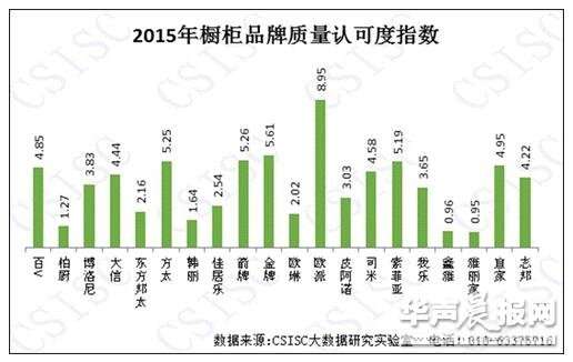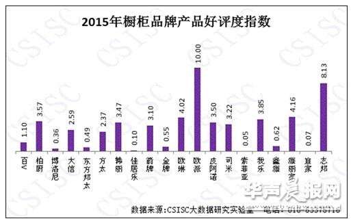 《报告》显示,2015年度橱柜品牌的网络口碑指数差异明显。欧派一枝独秀,以绝对优势拔得头筹,志邦、箭牌、方太紧随其后,成绩优秀,其它品牌口碑指数的表现参差不齐,发展空间很大。在品牌知名度、消费者互动度和质量认可度、企业美誉度和产品好评度5个方面,欧派成绩一路领先,箭牌、方太、金牌、大信、志邦分别在产品知名度、消费者互动度、质量认可度、企业美誉度、好评度、健康度中获得优秀成绩。