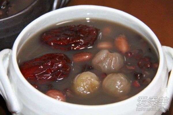 红豆50公克、红衣花生30公克,红枣、桂圆肉各8颗、红糖5公克。