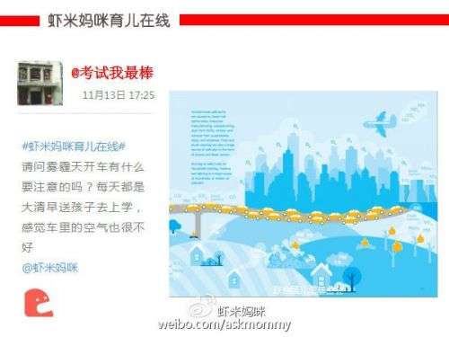 虾米妈咪:在雾霾天气里,切记要关闭车窗和天窗,不要用开车窗的方式来通风,关闭车窗,同时将空调设置成为内循环。一定注意定期更换空调滤芯,否则汽车空调会成为二次污染源。还有一些专业的车载空气净化器,或者专门针对PM2.5的汽车空调滤芯,大家可以去了解。此外,因为雾霾天的能见度很低,在开车时要小心驾驶,打开雾灯,必要时打开双闪,保持比较低的车速拉开车距。
