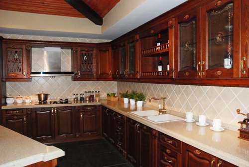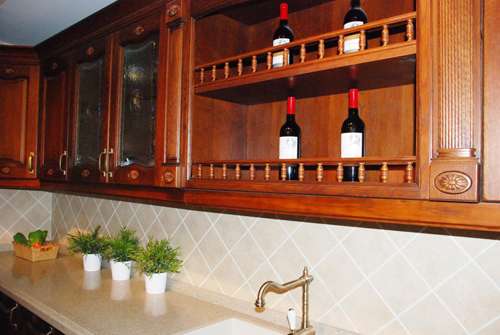 位于门口处的这款高端大气上档次的厨柜,无论是储物柜的廊桥式设计,还是罗马柱的雕刻,都有一种田园风格的清新气息。