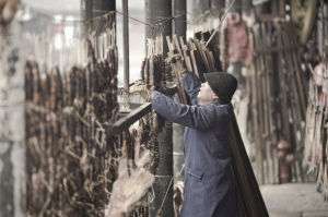 初冬一到,绍兴人便纷纷开始制作腊肠,而安昌腊肠则是其中的代表。每到冬令时节,在安昌老街上,家家户户的沿街廊坊下都挂满了腊肠。初冬是阿勇一家相对忙碌的时节,因为他家制作的腊肠在安昌小有名气。除了自家食用,和很多安昌人一样,阿勇会把多余的腊肠拿到集市售卖以补贴家用。