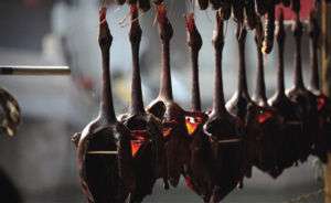 酱鸭一般是每年立冬之后至立春之前腌制,绍兴人常常在小雪节气之后便着手腌制酱鸭。在齐贤镇老街,老房子的屋檐下都已经挂满了酱鸭。房主王大伯今年62岁,是地道的老绍兴人,按他的话说,只要是老绍兴人,谁不会做酱鸭呢?