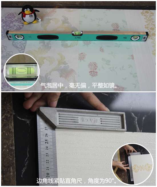 虽然威尔斯这款千珠幻彩釉面砖表面具有轻微的凹凸感,但丝毫不影响整体的平整度。经小编用水平仪器测量发现,水平观察窗中的气泡居中无偏向,平整度高。另外,瓷砖边角线条无弯曲,与直角尺紧密相贴,垂直度高,角度为