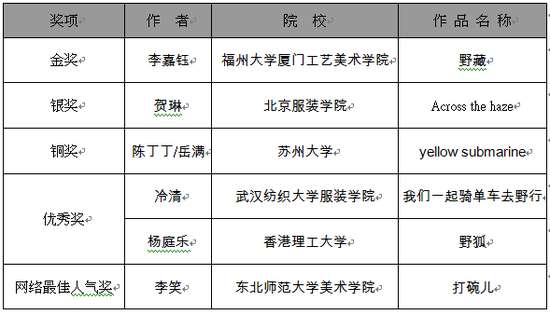 组入围作品依次登场,借助风格各异的音乐、绚丽的舞台效果及专业化走秀展示,异彩纷呈的设计新作淋漓尽致地展现在观众眼前,给观众带了一场精彩的视觉盛宴。经过激烈角逐,在“黄金评审团”的严格甄选下,最终来自福州大学厦门工艺美术学院李嘉钰的《野藏》凭着独特的设计理念、精致的成衣效果及剪裁摘下桂冠,获得本届大赛的最高荣誉金奖;本届大赛其它奖项也悉数产生。