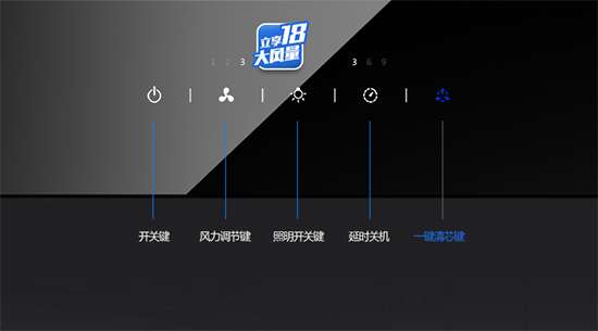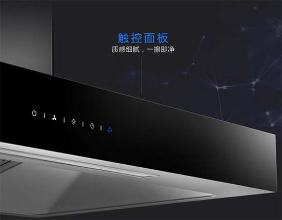 华帝i11061抽油烟机的触控面板很炫,黑色彰显高档品质。右侧为控制区域,通电时按下开关键,时钟亮起。从左到右,按键分别是开关、风量大小、灯光、时钟和加热自动洗控制。