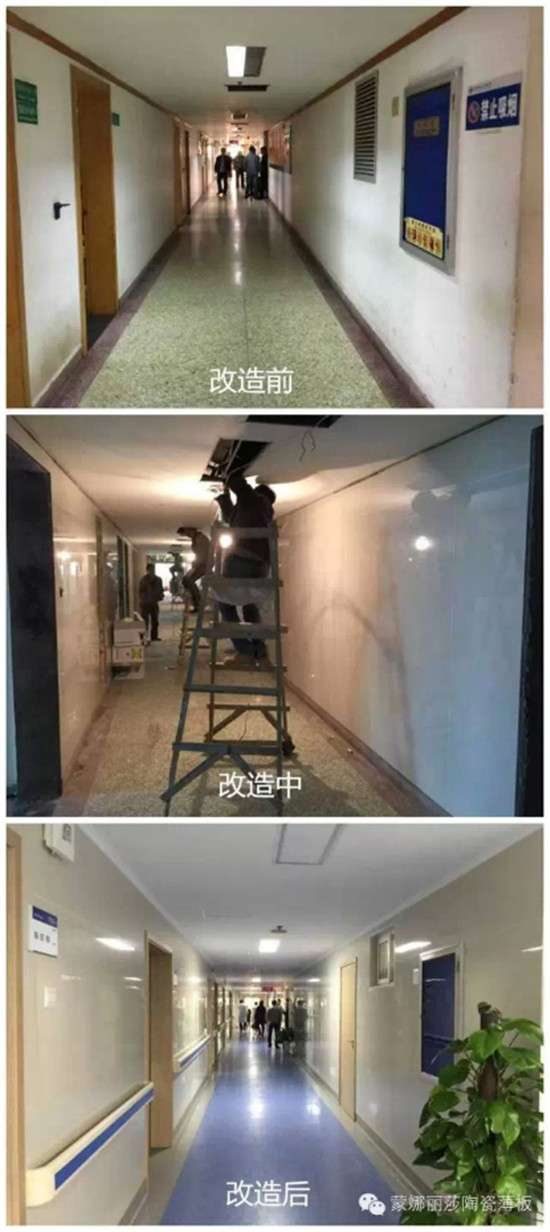 陕西省人民医院使用超过40,000平方米的蒙娜丽莎陶瓷薄板进行室内墙面改造,改造后的室内墙面接驳少、缝隙小,进一步降低细菌滋生的几率,为医院打造了明亮、抗菌、装饰性强的良好空间环境。